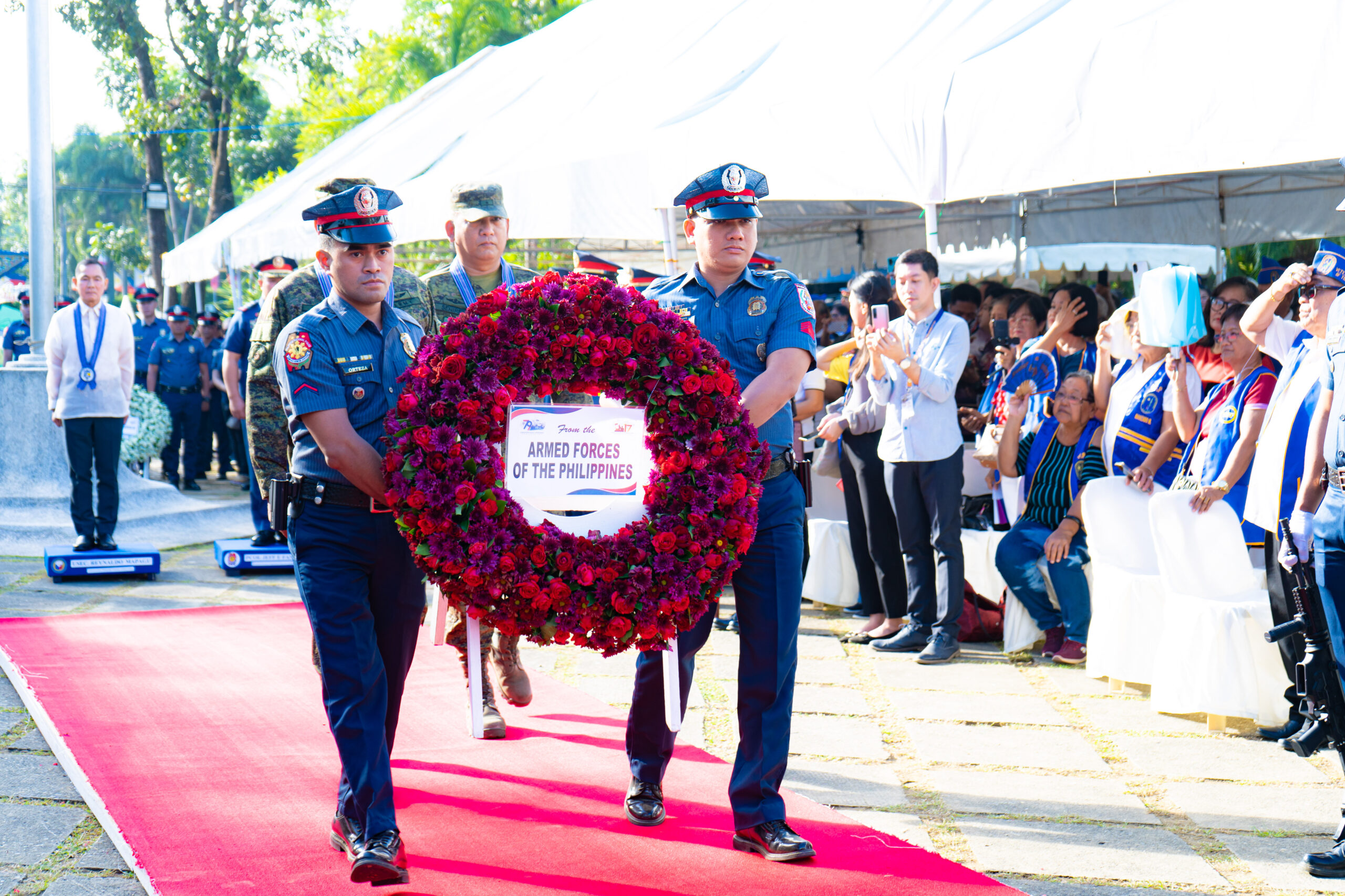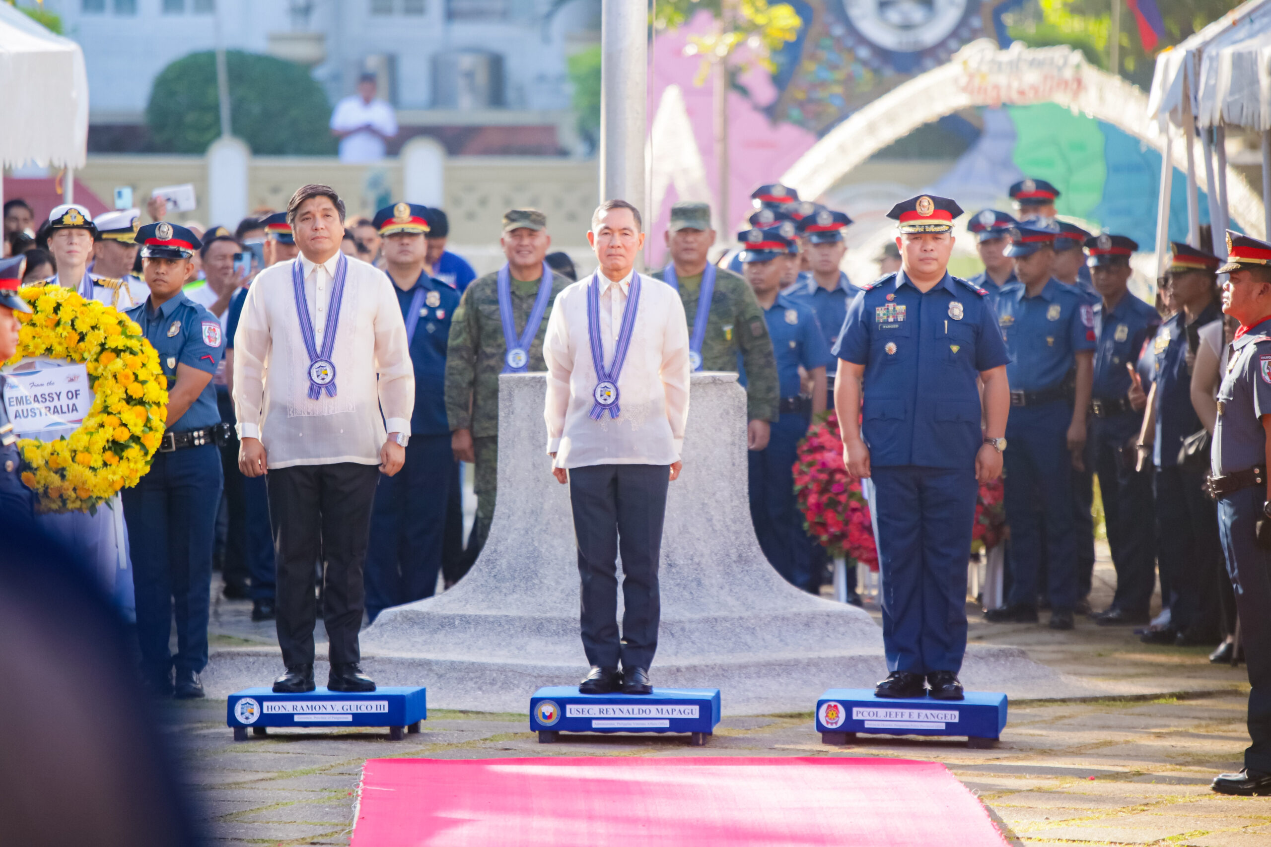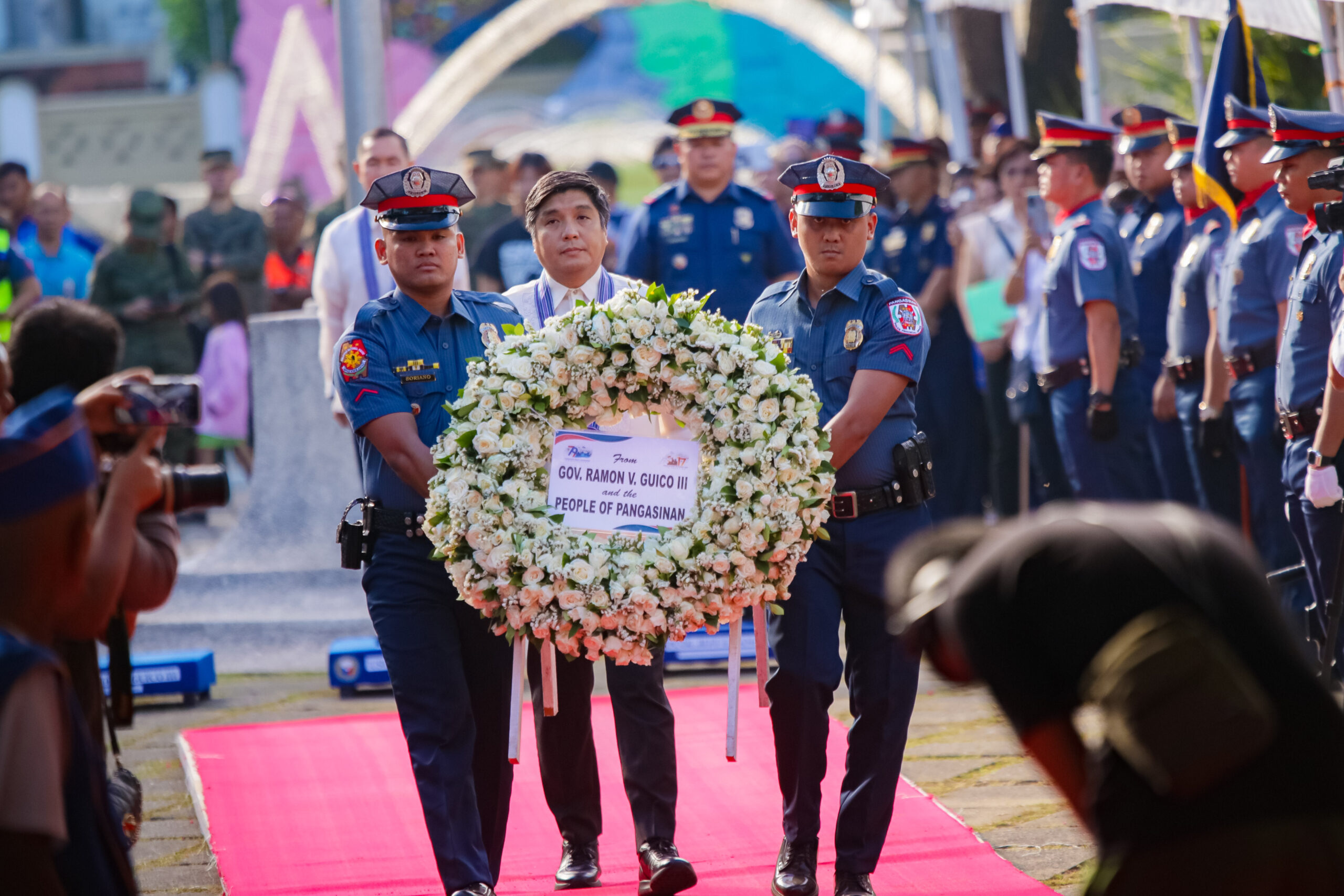 The program formally started with a thanksgiving mass presided over by Archbishop Fidelis Layog, followed by the wreath laying ceremony with WWII veteran Mr. Hospicio Mallari, Commander Emma McDonald-Kerr (Defense Attaché of the Australian Embassy in the Philippines representing Her Excellency Ms. Hae Kyong Y), Captain Noel Corpus (Naval Attaché of the Embassy of the United States of America representing Her Excellency Ms. MaryKay L. Carlson), Major PCOL Jeff Fanged (Provincial Director of the Pangasinan Police Provincial Office), MGEN Romeo Alamillo, Governor Ramon V. Guico III, and USEC Reynaldo Mapagu (Administrator of the Philippine Veterans Affairs Office representing Secretary of National Defense Gilberto Teodoro Jr.).